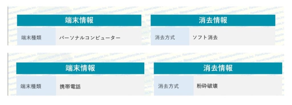 リネットジャパンでは、HDDのデータ消去の方法が、データ消去ソフトによる消去なのか、物理破壊なのかが記載され、データ消去証明書が発行されるため、安心のサービスです。