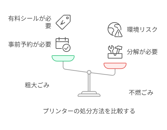 地域の自治体によってごみの分別方法が異なるため、プリンターが「粗大ごみ」なのか「燃えないごみ」なのか判断が困難だからです。また、家庭用プリンターは小型家電リサイクル法の対象品であり、適切なリサイクルが法的に推奨されています。